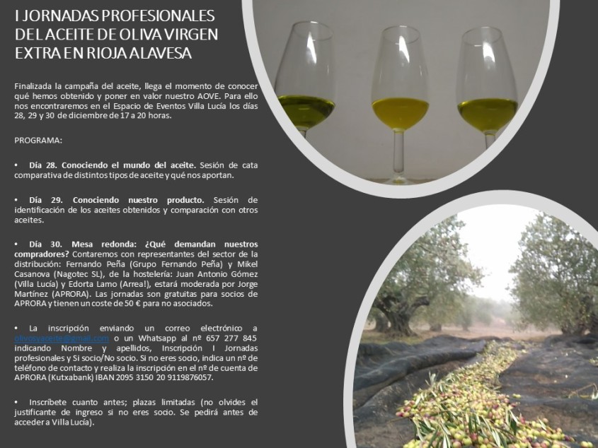Las I Jornadas profesionales del aceite de oliva virgen extra en Rioja Alavesa se celebrarán los días 28, 29 y 30 de diciembre en el espacio de eventos Villa Lucía. Finalizada la campaña y con el fin de poner en valor el aceite de oliva de la máxima calidad obtenido, APRORA, Asociación para la promoción del olivo y del aceite de Rioja Alavesa ha organizado unas jornadas dirigidas a todos asociados: olivicultores, trujales y marcas de la zona, así como a otros profesionales del sector interesados.
