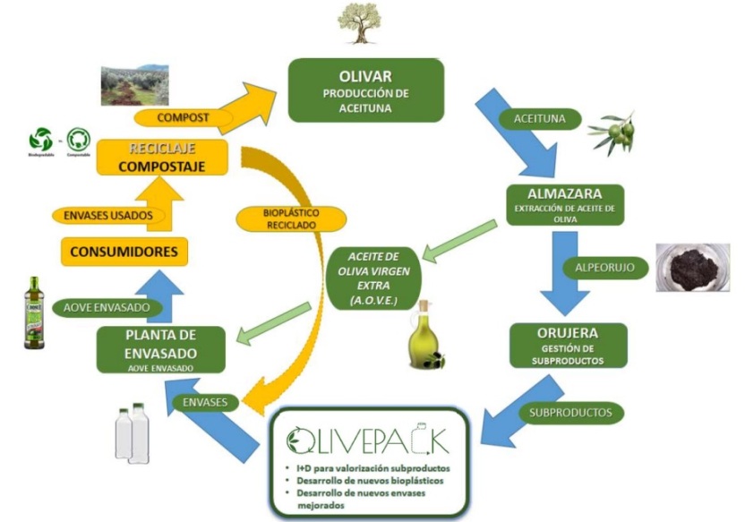 Olive Pack es un proyecto de I+D que tiene una doble carga de circularidad pues pretende generar un material biobasado, y biodegradable, además de incorporar la economía circular asociada a nuestros subproductos, obteniendo botellas totalmente sostenibles y con mejores prestaciones técnicas que el PET (plástico) en lo referente a resistencia, impermeabilidad al oxígeno o preservación frente a la luz.