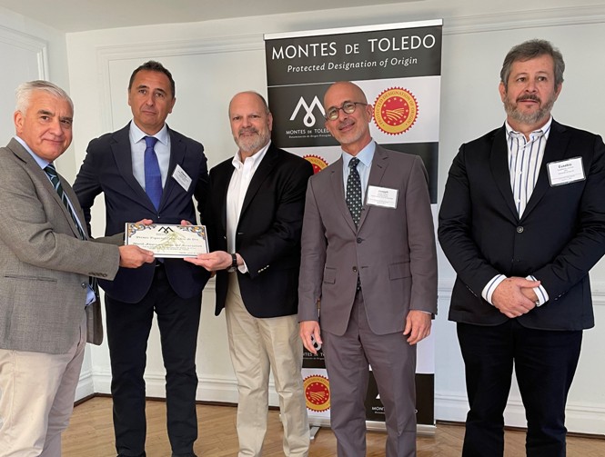 El presidente de la asociación, Marco De Ceglie; y su director ejecutivo, Joseph R. Profaci, recibieron la placa conmemorativa de cerámica talaverana de manos del director de la denominación de origen, Enrique García Tenorio, acompañado de su vicepresidente, Alberto Sánchez, de Aceites Toledo; y Eusebio García de la Cruz, de Aceites García de la Cruz, empresas de la DOP Montes de Toledo presentes en la Summer Fancy Food junto con Casas de Hualdo.