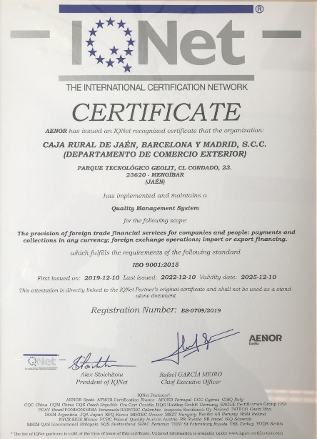 Caja Rural de Jaén, Barcelona y Madrid, ratifica su compromiso e implicación con la excelencia en el desempeño de sus funciones, mediante la renovación de la certificación del sistema de gestión de la calidad ISO 9001, para el departamento de comercio internacional, y por parte de la Asociación Española de Normalización y Certificación.