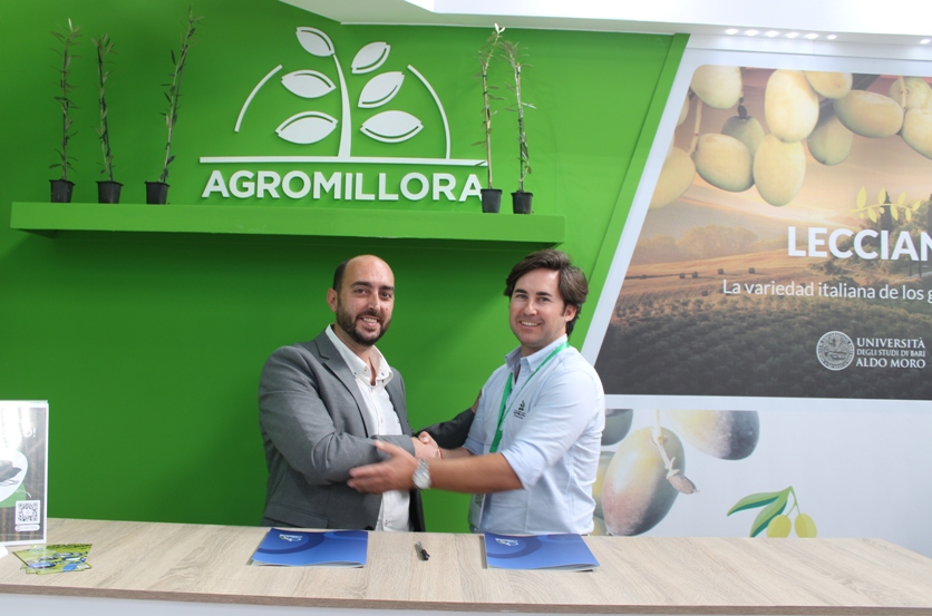 Javier Gámez, presidente de la Asociación Olivar y Aceite, entidad gestora del Centro de Interpretación de Úbeda, y Cristobal Sánchez, delegado comercial de la empresa Agromillora Iberia en Andalucía, cuya actividad es la producción y comercialización de árboles frutales, olivar y viña, procedieron a la firma de un convenio de colaboración en el marco de Expoliva.