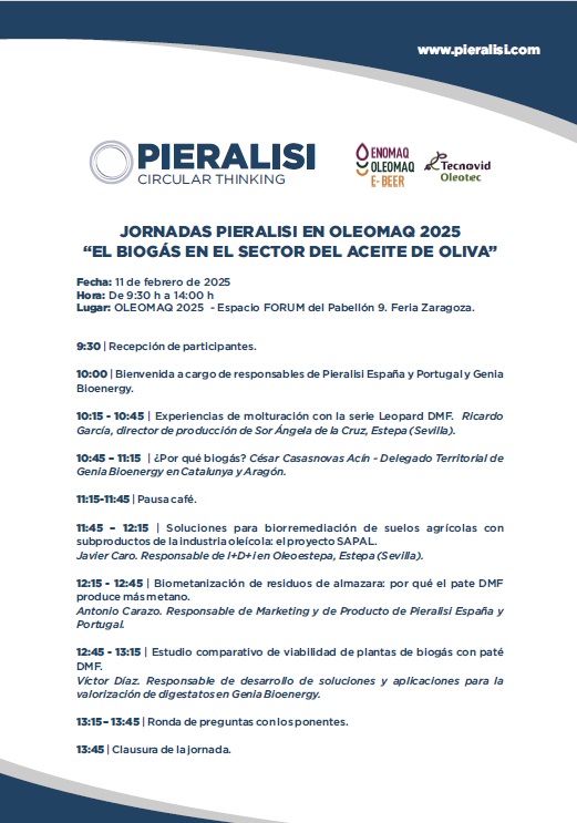 En este marco, la multinacional italiana lidera y organiza las jornadas sobre el potencial del biogás en el sector oleícola que se celebrarán en la mañana del 11 de febrero, en horario de 9:30 h a 14:00 h, en el Espacio FORUM del Pabellón 9 de Feria Zaragoza. Además, Pieralisi España y Portugal forma parte del comité organizador y cuenta con una superficie de exposición de más de 100 metros cuadrados.