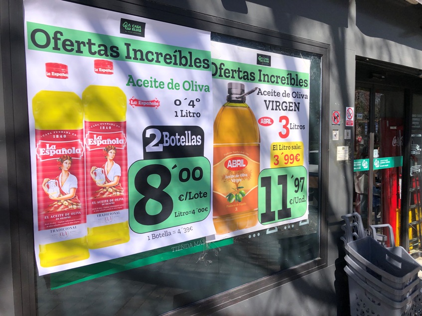 La Gran Distribución se siente cómoda con los precios en origen del aceite de oliva que le permite mantenerlo como “producto reclamo” en fachadas y folletos publicitarios, tanto de Marca de Distribuidor como de conocidas marcas. En torno a los cuatro euros litro tanto para el refinado de primeras marcas como incluso en los cuatro euros para el virgen y virgen extra en ofertas puntuales para garrafas de cinco litros en segundas marcas.